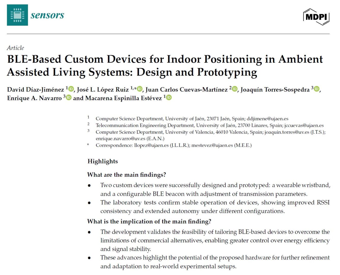The article, entitled “BLE-Based Custom Devices for Indoor Positioning in Ambient Assisted Living Systems: Design and Prototyping”, describes the development of two reconfigurable devices: a smart wristband integrating inertial and biometric sensors, and a configurable BLE beacon (ASIA Beacon) capable of dynamically adjusting its transmission parameters. Both hardware components were designed to overcome the limitations of commercial devices in key aspects such as energy efficiency, signal stability, and data transparency.